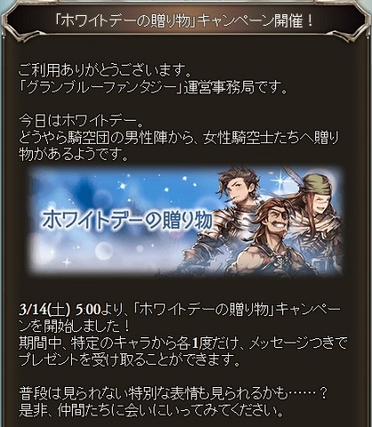 バレンタインのイベントがあまりにもショッパかったので、まったく期待していなかったホワイトデーなんっすが、ゲーム要素は皆無だけれどムダに豪華なブツがやってきたのですよ。