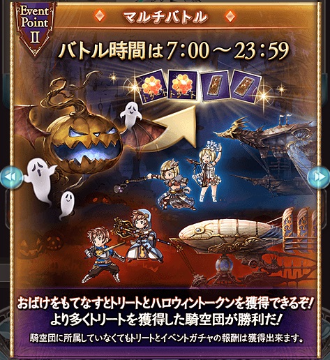 キャラ2名だけで、専用クエストも無いようで肩透かしっぽいハロウィンなんだけど、騎空団イベントがハロウィン仕様になって開催されるとのこと。