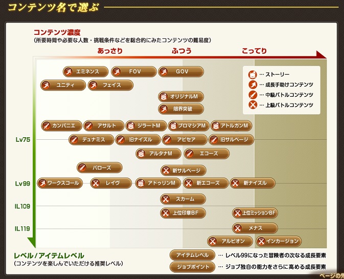 コレ ↑ 公式サイトにある各コンテンツの難易度などの一覧表で、私もプレイの開始を検討した時に参考にさせてもらったんだけれど、コイツを見ると「M」とついているミッション(メインストーリー)はLv75~Lv99で遊べるように見えるじゃないっすか。