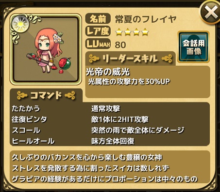 ↑ はPvPイベントで遭遇した他プレイヤーさんのユニットなんっすが、主人公の衣装違いバージョンって水着、クリスマス、ホワイトデーの3種類ありまして、今回復刻したら他のも来るぞ!と期待できたんっすが………来ないのかなぁぁ。欲しいのになぁぁ。