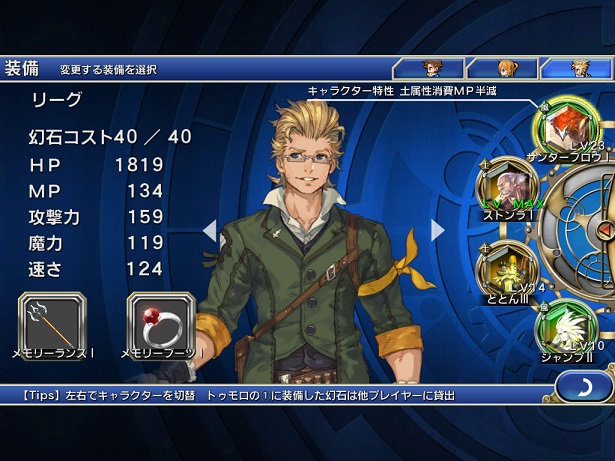 このリーグって兄ちゃん。使用武器が槍で、竜騎士ジャンプを披露してくれたもンだから、てっきり「風」属性だと思い込んでいたんだけど、よく見たら「キャラクター特性 土属性消費MP半減」じゃないか!