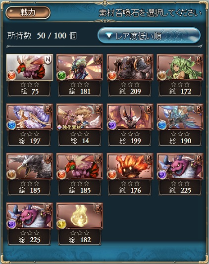 ↑ 手に入れた召喚石の一覧。最初のNは本日の無料ガチャ産。