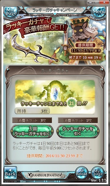 上画像右は、本日で最終日を迎えたラッキーチャンスガチャの画面。