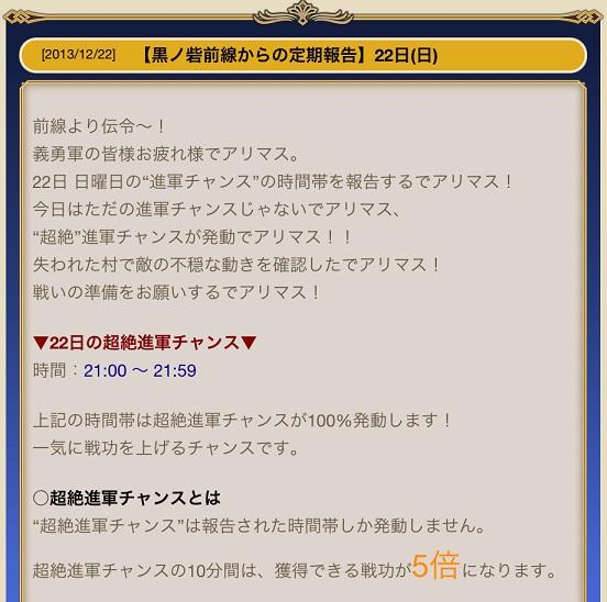 3連休ど真ん中の21:00~21:59に戦功5倍。