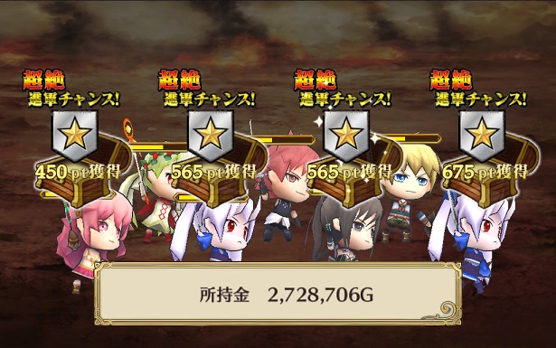 もしくは木箱からは“討伐の証”と言う、アイテムと交換できるポイント(ランキングはNG)を落とすようにし、10の倍数時は銀箱「も」落ちて武器やR以上キャラが出る。