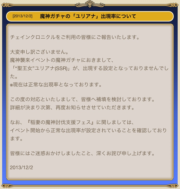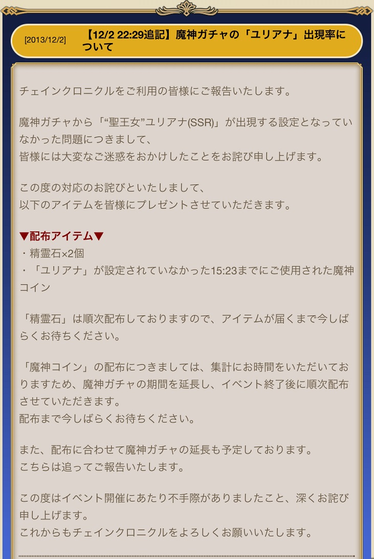 現場の惨状がなんとなく透けて見えてるこの状態で、この対応を決めたってのは評価しますわ。でも次は無いように気をつけてなー。マジで精霊石ガチャでやったらアカンぞ~。