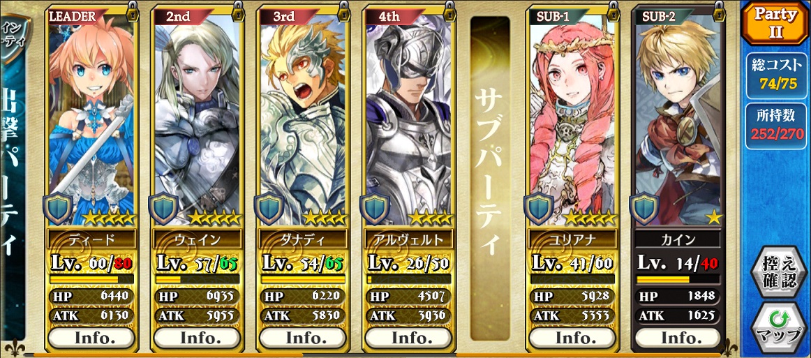 3本柱は育成完了。激を飛ばすユリアナさんもベンチで固定。後はアルヴェルトとイルヘルミナさんを育成しつつ、カイン君をストーリーを見られるLvになるまでサブに入れておこうと考えとります。