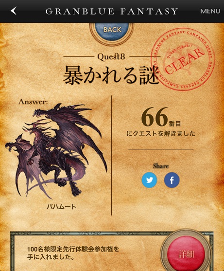 一応、クイズを解いた先着100名だとか言うので、某所でカンニング(w)しつつ、うんうん唸りながらどうにかクリア。