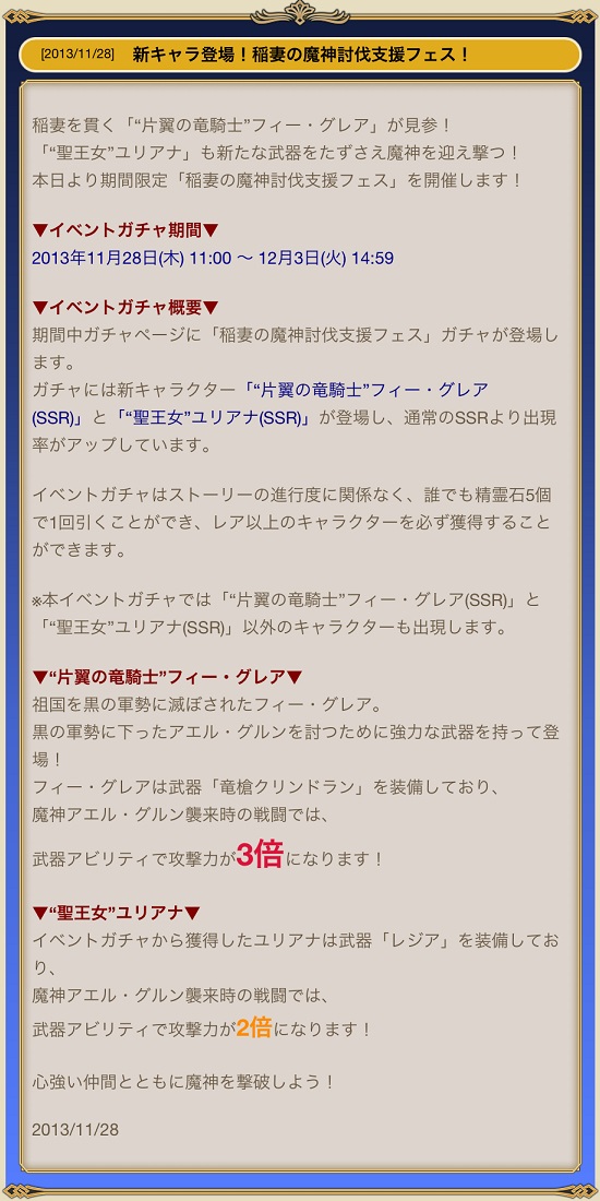 さらに、前回のガチャフェアと同じで、SSRの排出確率は普段と同じで、どのSSRが出るか抽選時に竜騎士と聖王女の確率が上がっているだけっぽい。