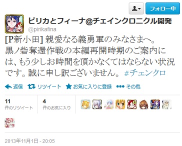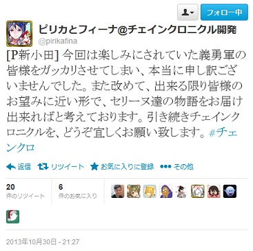 ニコ生『セガネットワークス at AppBank』で【チェインクロニクル】についてお詫びがある、と始まったのである意味期待したんだけれど、イベント“黒ノ砦奪還作戦”についてサーバーパンクで中止になり現在再開に向けて作業中。というすでに分かっている情報だけで、再開時期も一番の懸念であるランキングと特効についても発言は無し。