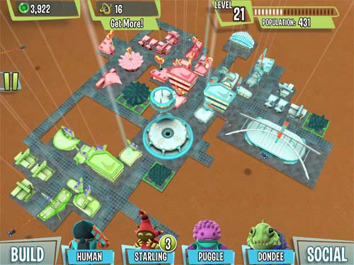 こっちは建物に働く人間を登録でき、登場する宇宙人が4種族いてそれぞれ仕事の時間や成果に影響を与えるスキルを持っているので、時間のかかる建物にスピードアップを4人入れて、なんてことが出来るので面白いんだけれど、こっちはこっちで困ったことに、建物のバリエーションが致命的に無し;