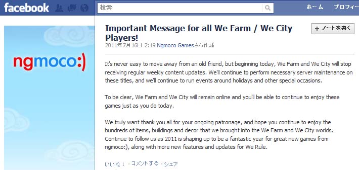 リリース&運営しているngmoco:)の公式メッセージで、「WE FARMとWE CITYの2作品については週ごとのアップデートは終了、ただしゲームの運営および季節イベントは行うので、これまで同様楽しんでね」との発表が。(たぶん)