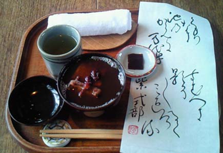 目的はコウモリの形をしたビスケットだったんだけれど、小雨が降ってきた&旅館が休みで完全貸切状態だったのと、寒さと空腹に負けてぜんざいを注文。
