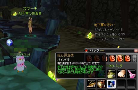 似たイベントで、「騎乗動物ペット祭り」「騎乗機械ペット祭り」ってのがあって、こっちも探査機で特定MAPを掘り続けるって代物なんだけど、こっちの探査機は1日使える分楽なんだよな~。