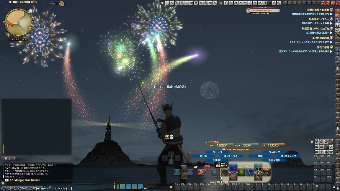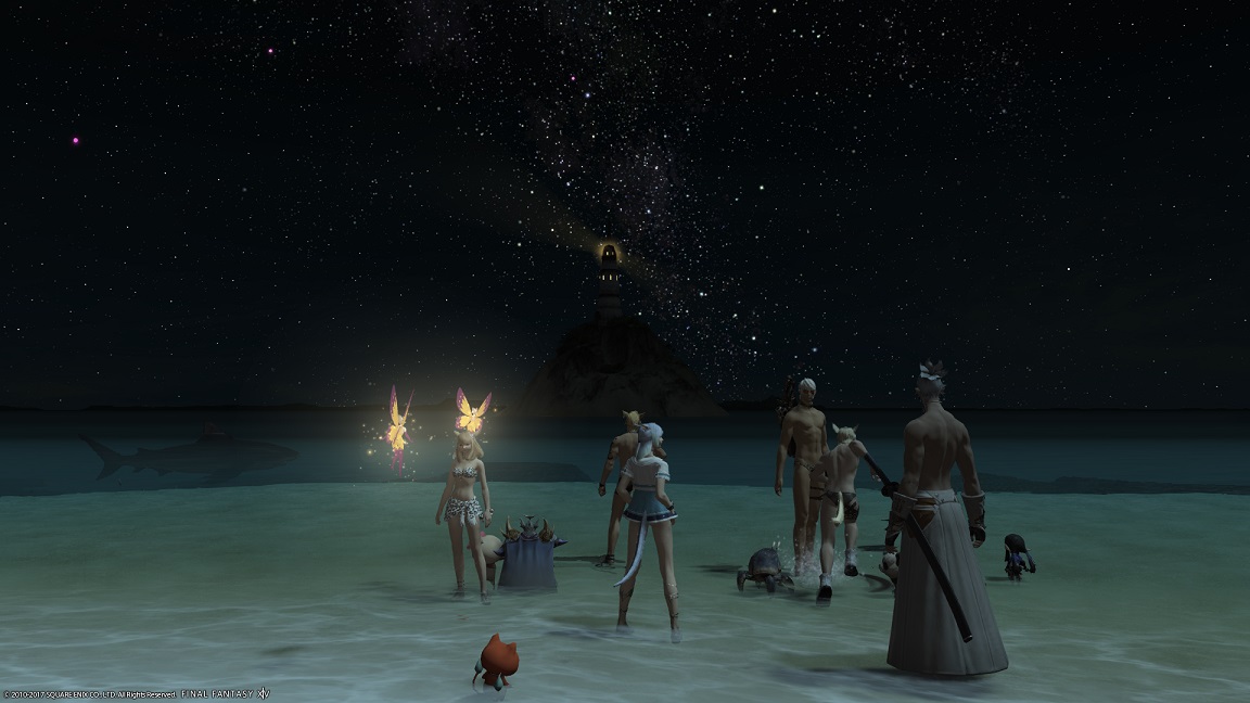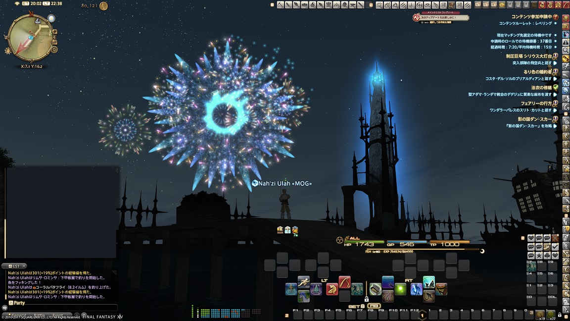 DQXだと花火はプレイヤーキャラが打ち上げる物なんだけれど、こちらはオートで打ちあがっているのが残念な反面、イベント会場以外の住宅地や主要都市からも同じ花火(だと思う)が見れるのが楽しかったり。